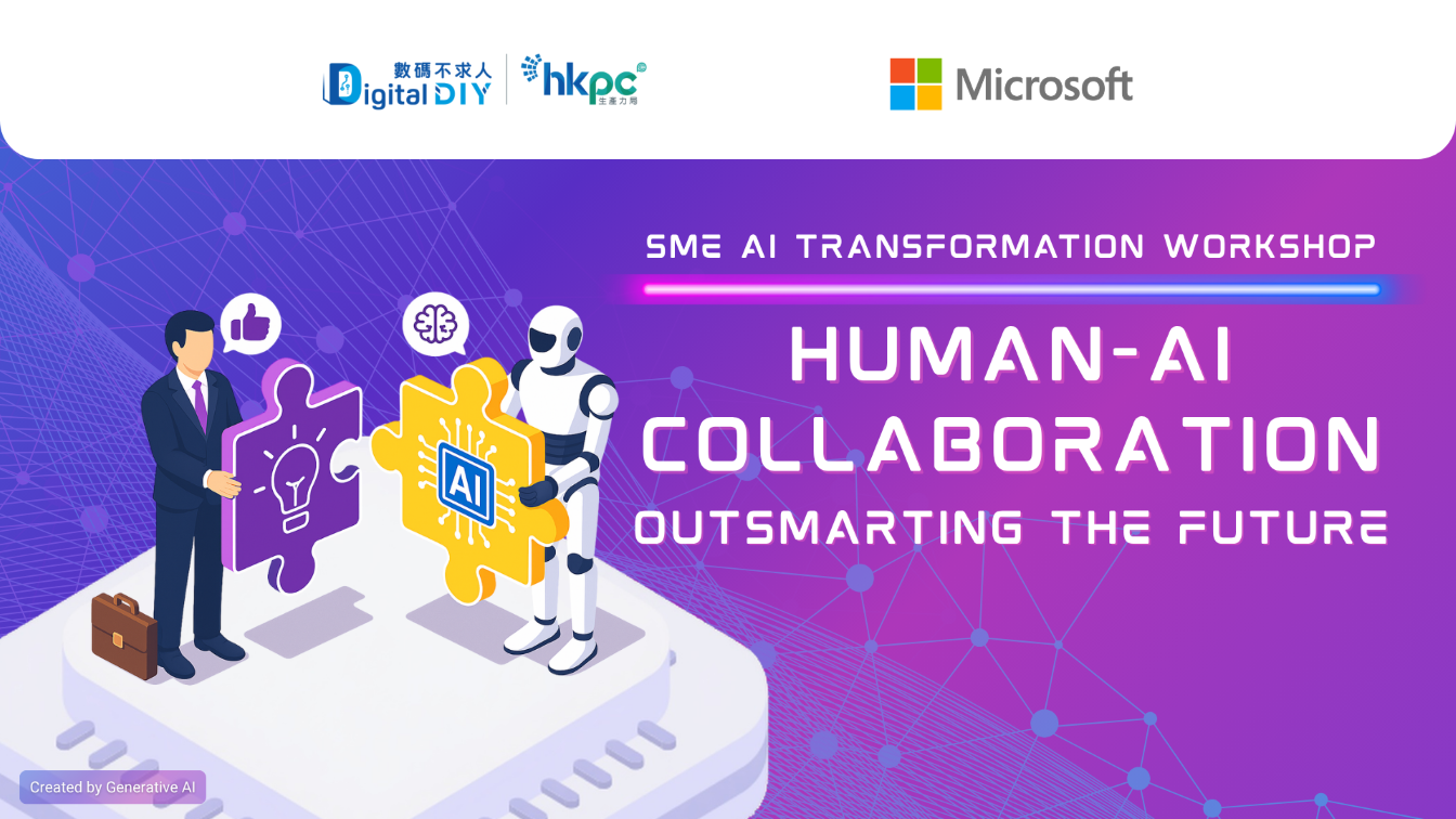 HKPC "Digital DIY" Portal is joining forces with Microsoft Hong Kong to co-organise the “SME AI Transformation Workshop: Human-AI Collaboration, Outsmarting the Future”, bringing together technical experts to explore with you how to apply AI tools across different domains—from team collaboration and operations to cybersecurity—to achieve comprehensive human-AI collaboration.