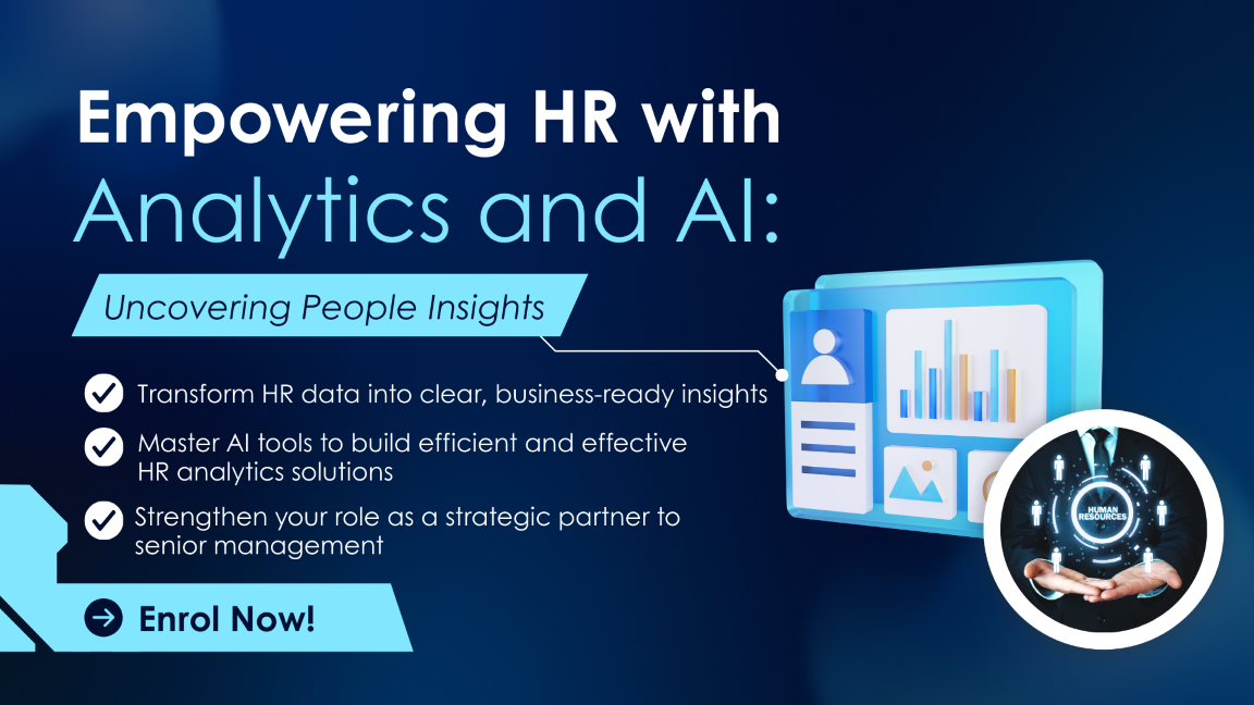 Join us for the “Empowering HR with Analytics and AI: Uncovering People Insights” to equip yourself with future-ready skills. This course is tailor-made for human resources practitioners and business managers. Led by an industry expert, you will be introduced to the core concepts and practical techniques of HR data analytics and learn how to use AI tools such as ChatGPT, Copilot and Canva to turn everyday HR data into business-ready insights.