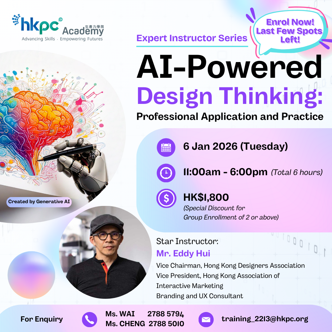 Led by industry authority Mr. Eddy Hui, Vice Chairman of the Hong Kong Designers Association, this course is tailor-made for designers, content creators, and marketing professionals. Through a balanced blend of theory and hands-on practice, you will learn how to combine traditional design techniques with GenAI tools to significantly enhance both the quality and efficiency of your work, while integrating Design Thinking to strengthen creativity and strategic focus.
