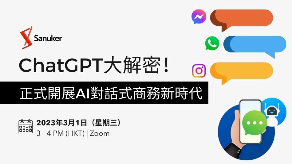 即時通訊專家 Sanuker 將於 2023 年 3 月 1 日(HKT3-4PM)舉辦Zoom研討會,即場試玩ChatGPT以及它如何賦能聊天機器人來幫助企業並提供前所未有的最佳客戶服務體驗,與你探索 ChatGPT 的無限商機。